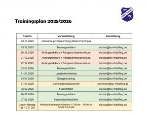 1 Startseite Winterprogramm 2025/2026 Liebe Skibegeisterte, es geht endlich wieder los. Voller Freude dürfen wir euch das diesjährige Winterprogramm vorstellen. Hier geht’s zur Übersicht: SKI Trainingsplan_2526 Eure Abteilung Ski Weiterlesen »